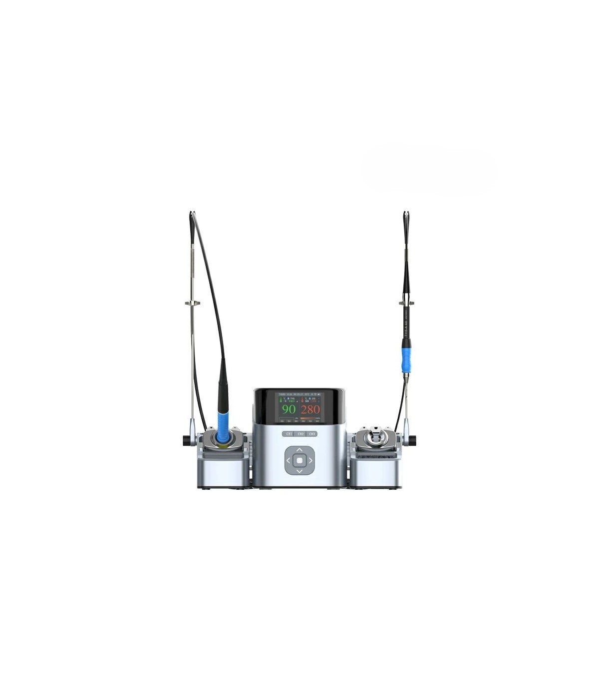 AIXUN T420D یک ایستگاه هویهٔ دوکاناله واقعی است که هم‌زمان با دو هندل کار می‌کند و هر سه خانوادهٔ T115 / T210 / T245 را پشتیبانی می‌کند. کنترل دمای پایدار با انحراف <1%، رسیدن به 350°C در ~۱ ثانیه و 380°C در ~۲ ثانیه، نمایشگر رنگی، و طراحی ایزولاسیون AC ضد‌نویز/ESD از ویژگی‌های کلیدی‌اند. منبع تغذیه ترانسفورماتور حلقوی توان لحظه‌ای بالا را تضمین می‌کند و سیستم شناخت خودکار هندل وضعیت هر کانال را پایش می‌کند. مناسب میکروسولدینگ زیر لوپ تا لحیم‌کاری قطعات بزرگ‌تر.