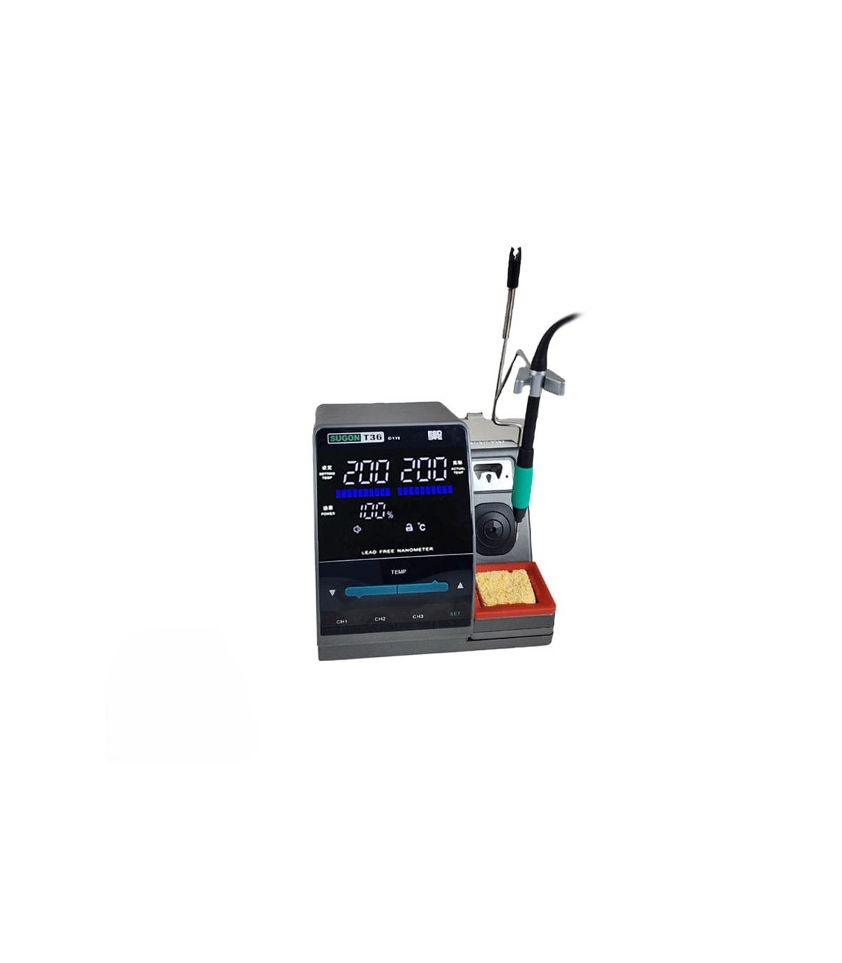 SUGON T36 یک ایستگاه هویه نانو با گرمایش بسیار سریع (≈۱ ثانیه)، ۳ کانال حافظه دما (CH1–CH3)، خواب خودکار القایی مغناطیسی و قابلیت کالیبراسیون دما است. دمای کاری رایج ۲۰۰ تا ۴۵۰°C بوده و درگاه ورودی AC 110/220V را پشتیبانی میکند. این مدل بهصورت پیشفرض با هندل C115 (Nano) ارائه میشود و با تهیهٔ هندلهای مناسب میتواند از سریهای JBC C210 / C245 نیز استفاده کند. ابعاد یونیت حدود 160×155×180 میلیمتر است. مناسب میکروسولدینگ زیر لوپ و کارهای دقیق SMD.