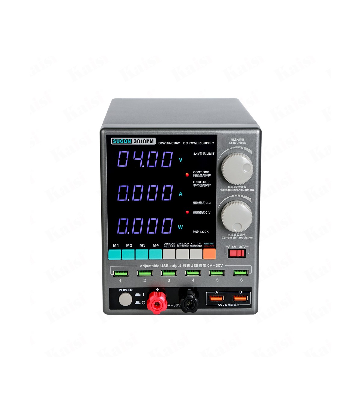 3010PM پاورسپلای رومیزی مخصوص میزِ تعمیرات و تست PCB است: خروجی ۳۰ ولت / ۱۰ آمپر با حالتهای CV/CC، نمایش توانِ بار، کلید قطع/وصل خروجی، و پنل USB با ۶ خروجی هوشمند قابلتنظیم + ۲ خروجی ثابت ۵V/2A. نسخههای ۱۱۰/۲۲۰V یا ۲۲۰V بسته به بازار عرضه میشود.