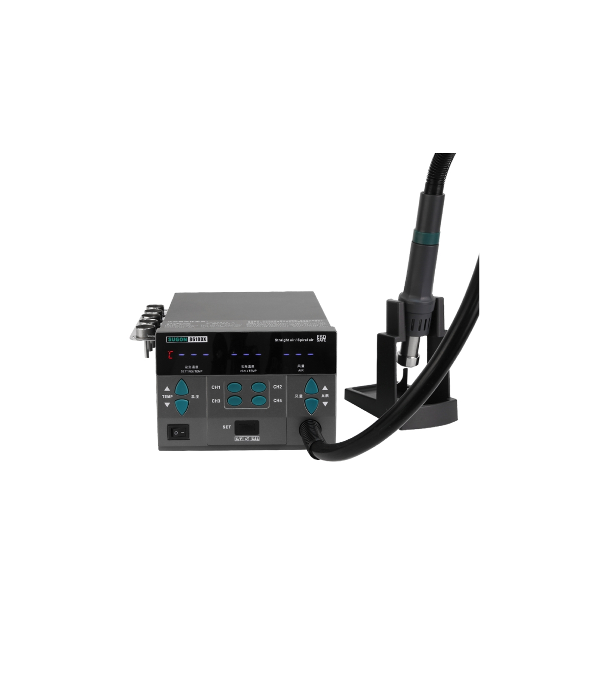 SUGON 8610DX PRO یک هاتاِیر 1000 وات با نمایشگر بزرگ LED و ۴ کانال حافظه (CH1–CH4) است. بازهٔ دما 100 تا 500°C، ۱ تا ۱۲۰ سطح باد و فلو ~91 L/min دارد. فن «براشلس ورتکس» دبی یکنواخت و صدای کم میدهد؛ سنسور مغناطیسی، خواب خودکار و کولدان بزرگ، عمر المنت را افزایش میدهند. بستهٔ استاندارد معمولاً ۵ نازل (۳ مستقیم 4/7/9mm و ۲ گردبادی 7/9mm) دارد. مناسب دیسولد/ریبال SMD و کارهای عمومی الکترونیک و تعمیرات موبایل.
